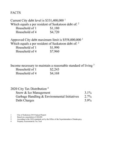 I feel that every resident of Saskatoon should fully understand just how much debt we are all currently in and how much additional debt we will be burdened with if some have their way during this time of crisis.